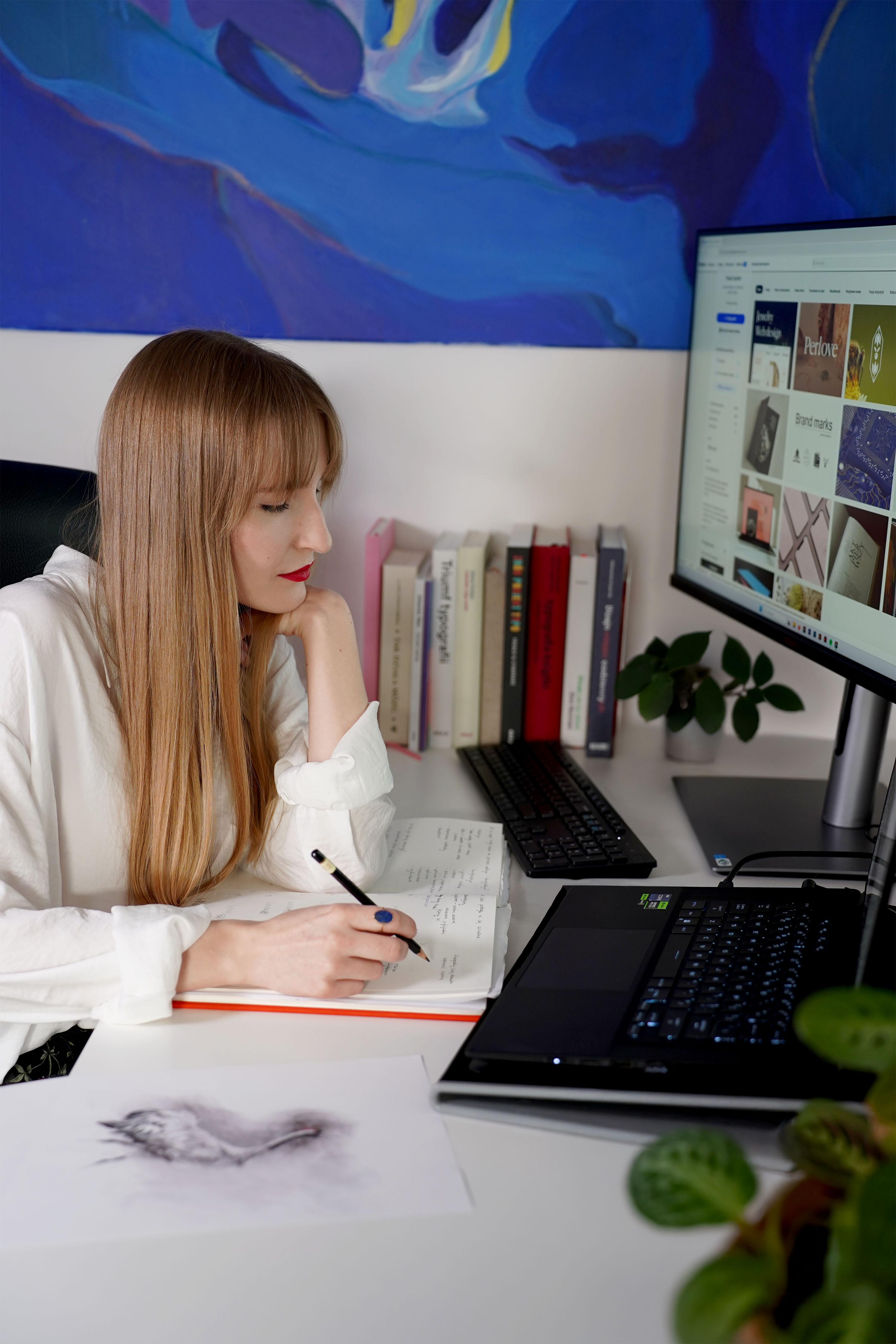 W swoim studio łączę analityczne myślenie z wrażliwością artystyczną. Indywidualizacja, Strateg i Wizjoner, to mieszanka z testu Gallupa, która oddaje moje podejście do pracy. Ciekawość napędza mój rozwój – kursy, konferencje, książki, wystawy, eksplorowanie nowych narzędzi. Sztuka i design to nie tylko moja praca, ale część mojego życia i codziennej inspiracji.